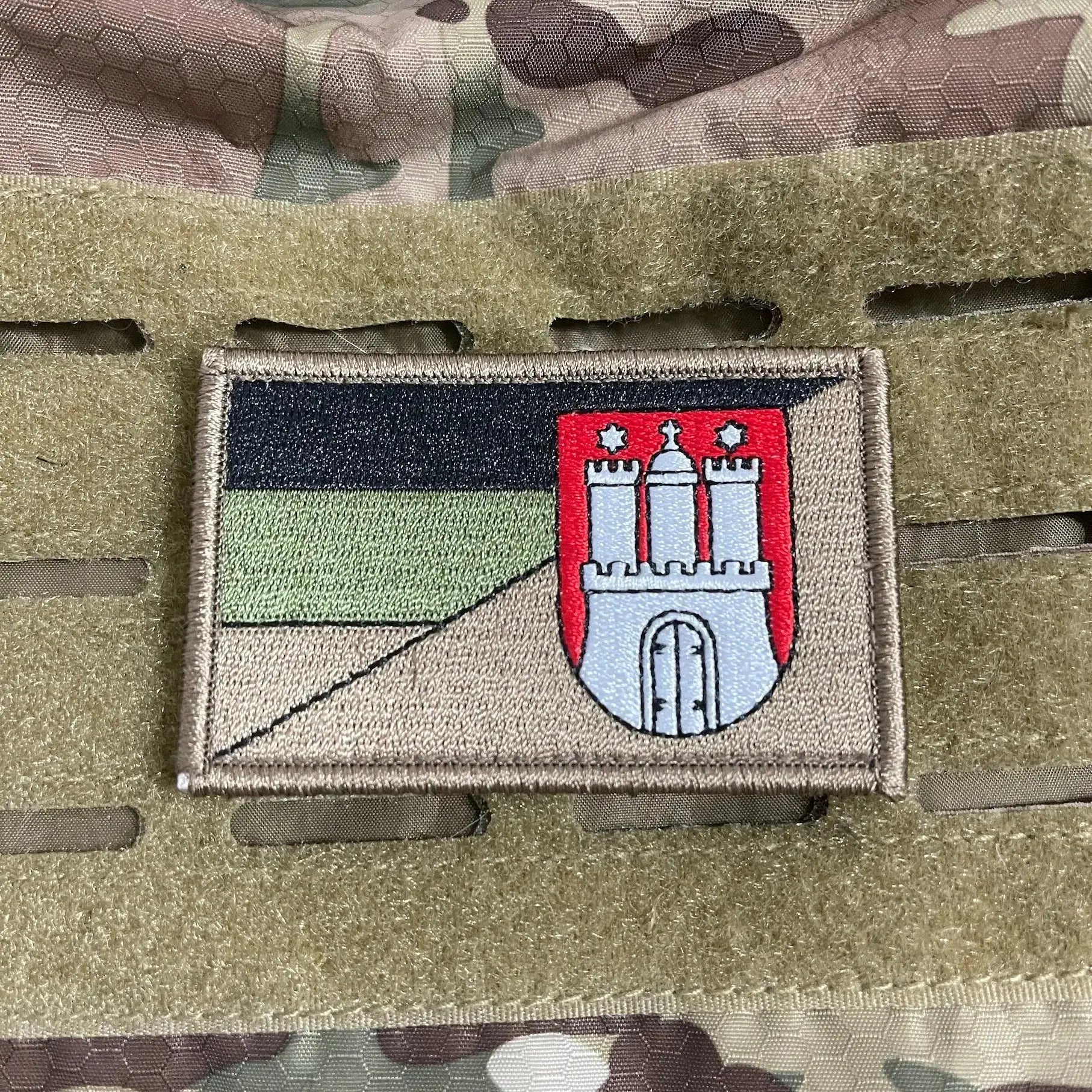 On the back there is a Hook and Loop surface, which is sewn with the patch. Thus the patch can be fastened on each loop surface completely simply. Loop Counterpiece attached. The compact size allows a quick and individual attachment to patch surfaces such as basecaps, backpacks, jackets, vests, helmets, etc..