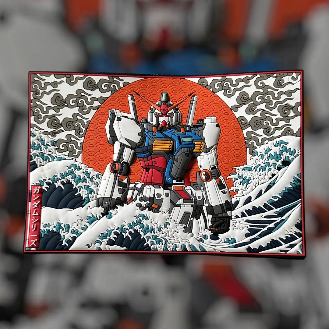 Emerging from the tumultuous waters depicted in the "Great Wave off Kanagawa", the Titan presents an awe-inspiring juxtaposition of man-made marvel and nature's fury. The iconic blue waves, with their white frothy tips, crash around the robot's limbs as it rises from the ocean's depths, causing powerful ripples and whirlpools in its wake.